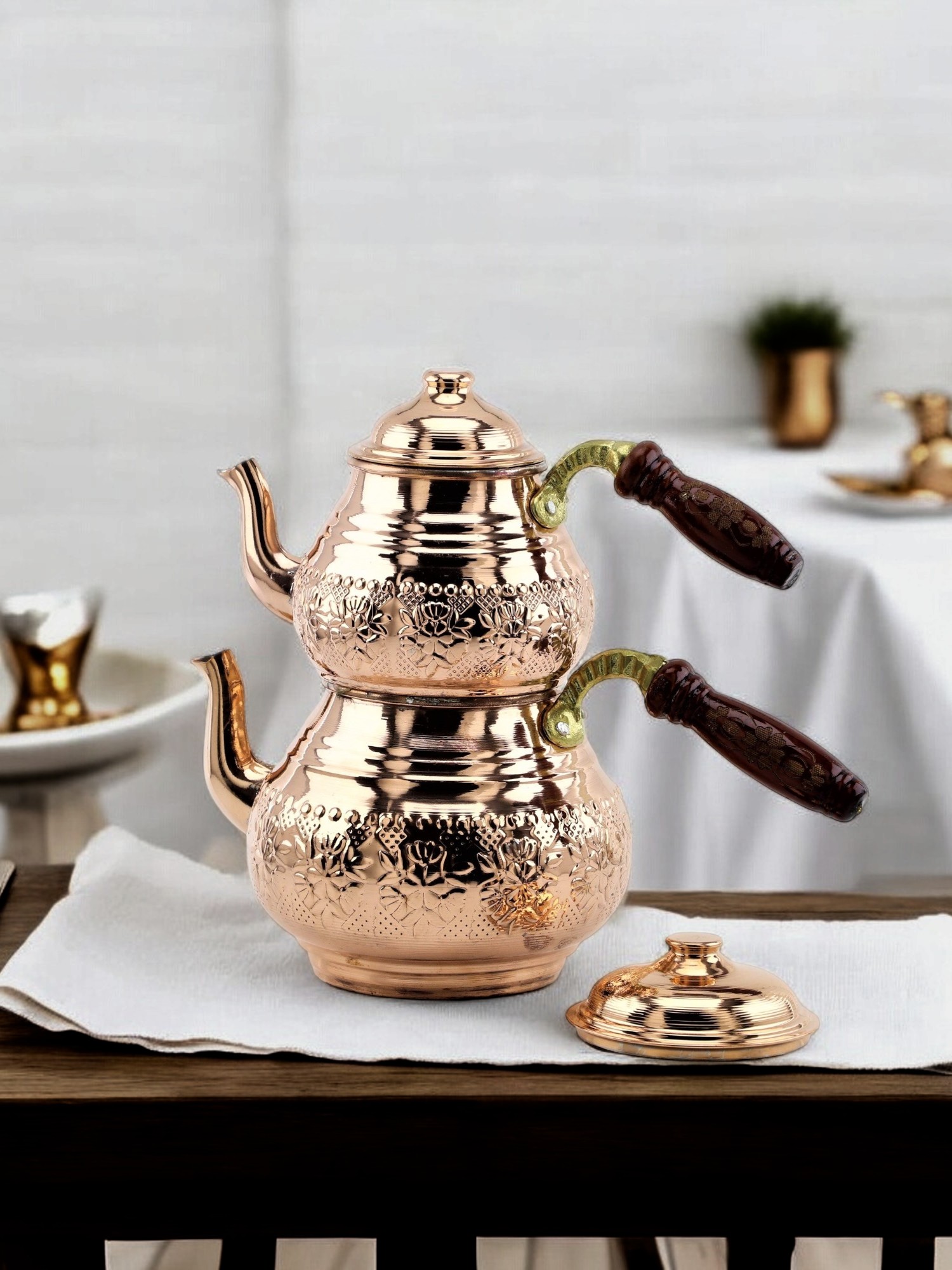 Geleneksel bakır işçiliğiyle hazırlanan bu çaydanlık, mutfağınıza hem estetik bir dokunuş hem de sağlıklı bir kullanım deneyimi kazandırır.